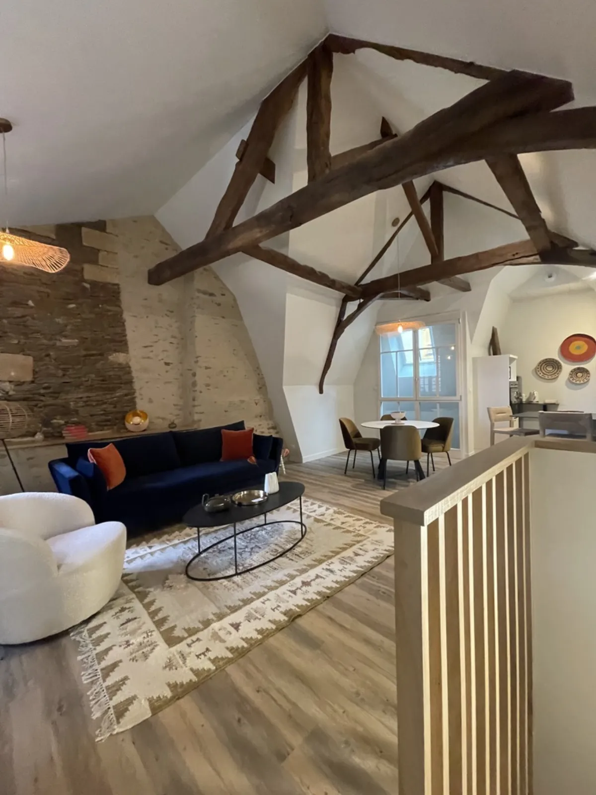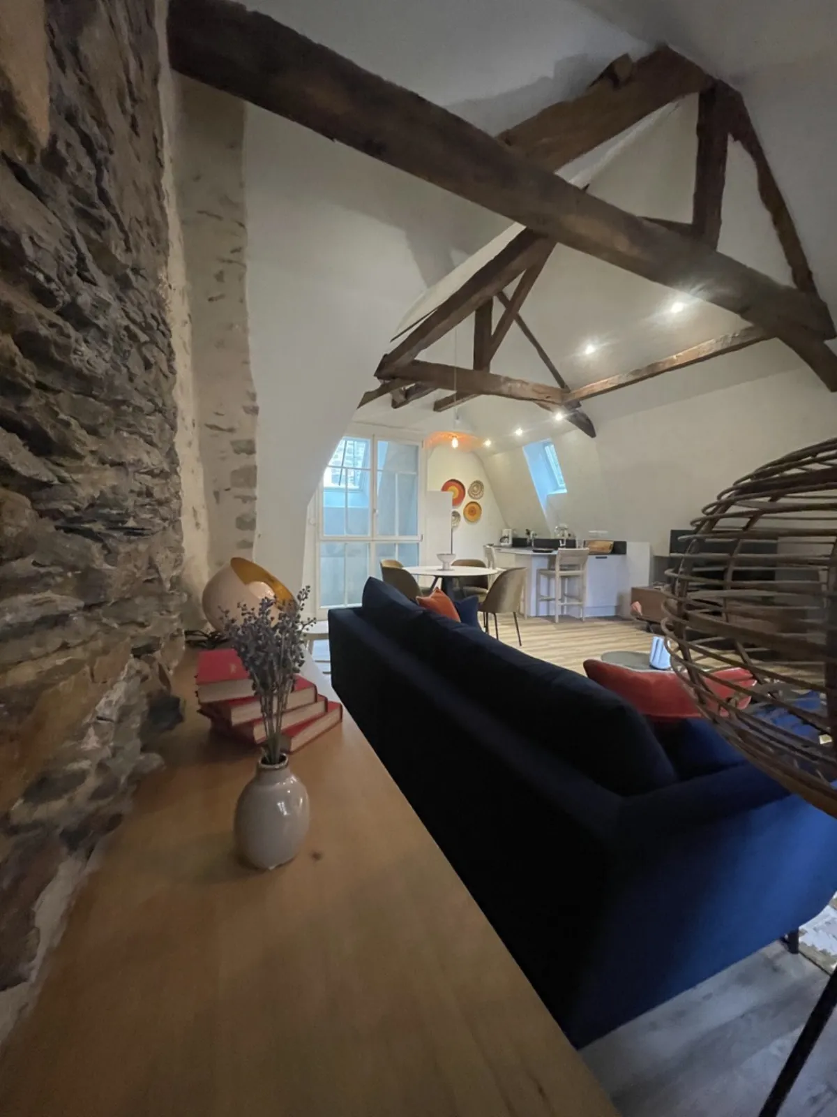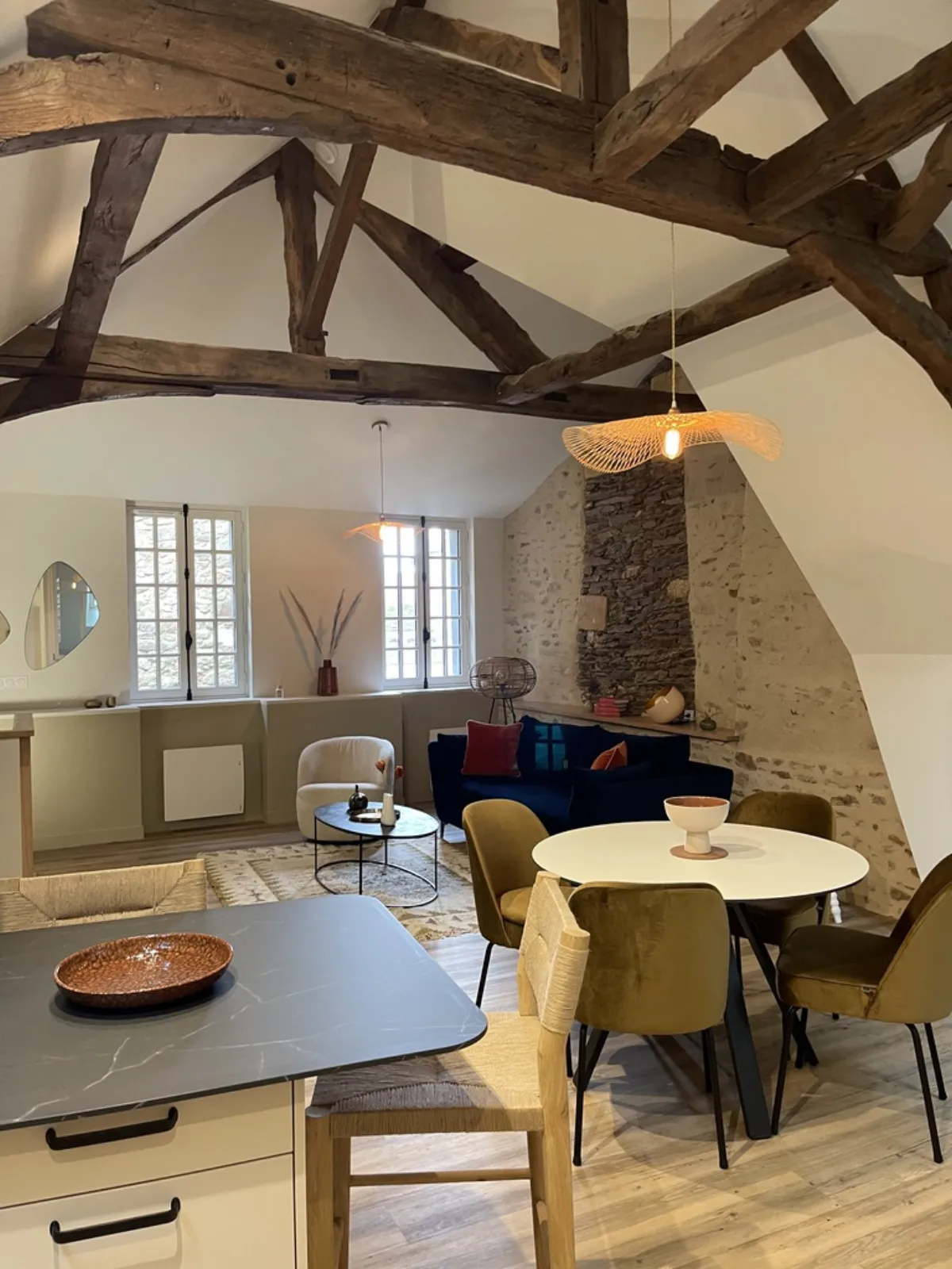 Aménagement sous les toits en mettant en valeur le bâti historique et le caractère authentique du lieu, en conservant les affres du passés ; escalier, charpente, l'histoire gravé sur les murs en pierre.