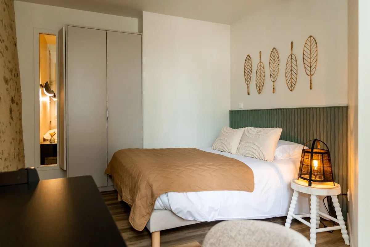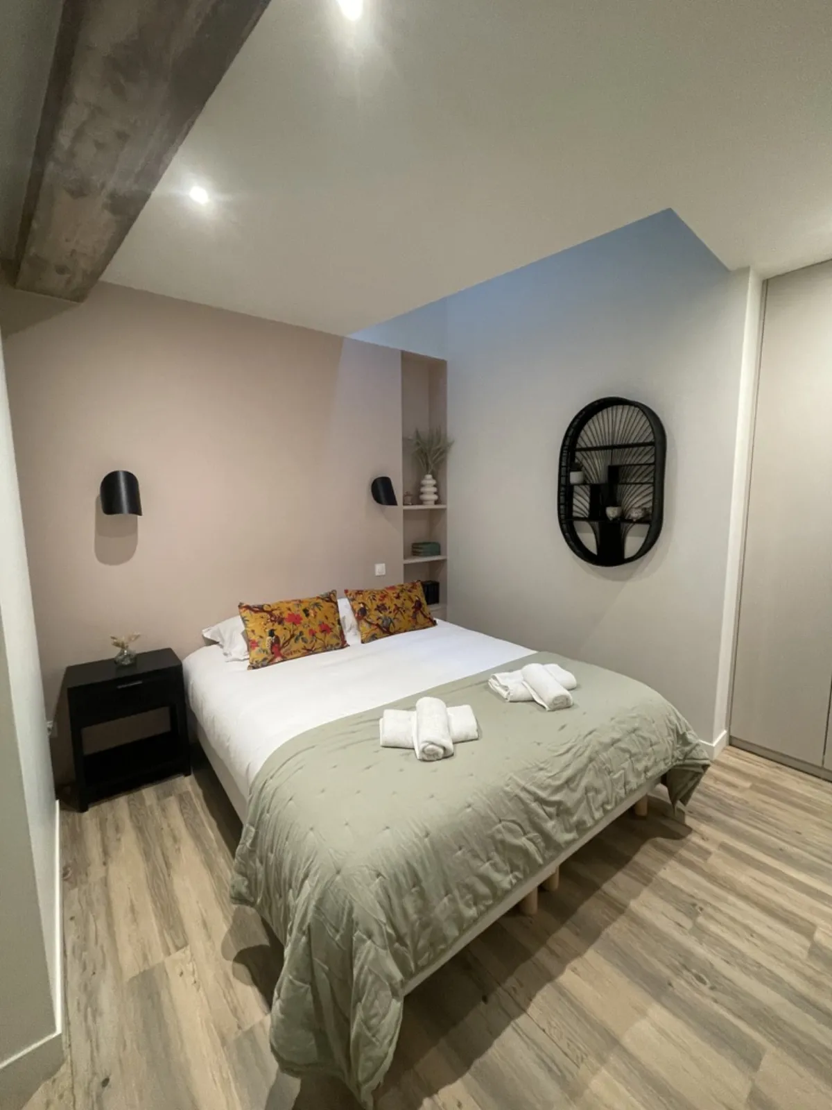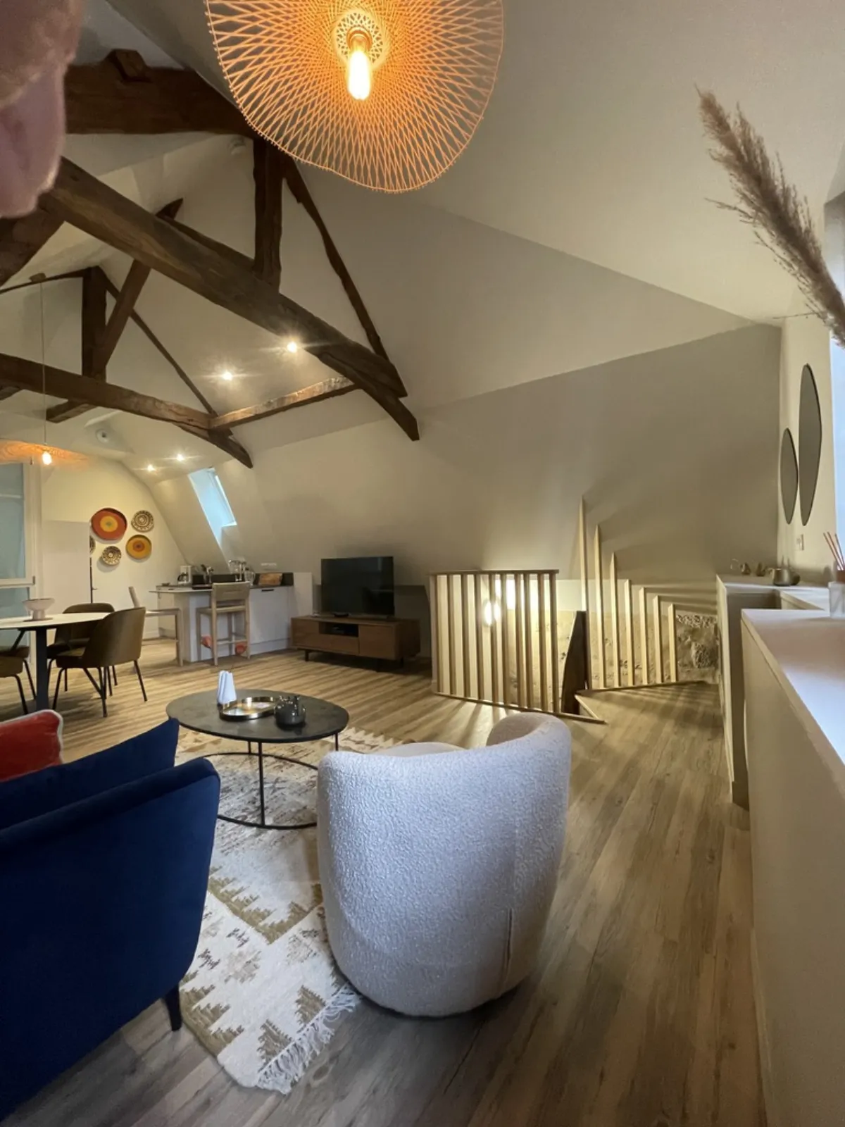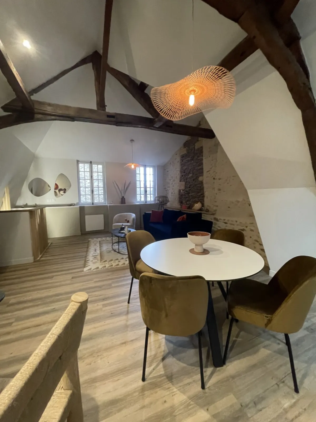 Aménagement sous les toits en mettant en valeur le bâti historique et le caractère authentique du lieu, en conservant les affres du passés ; escalier, charpente, l'histoire gravé sur les murs en pierre.