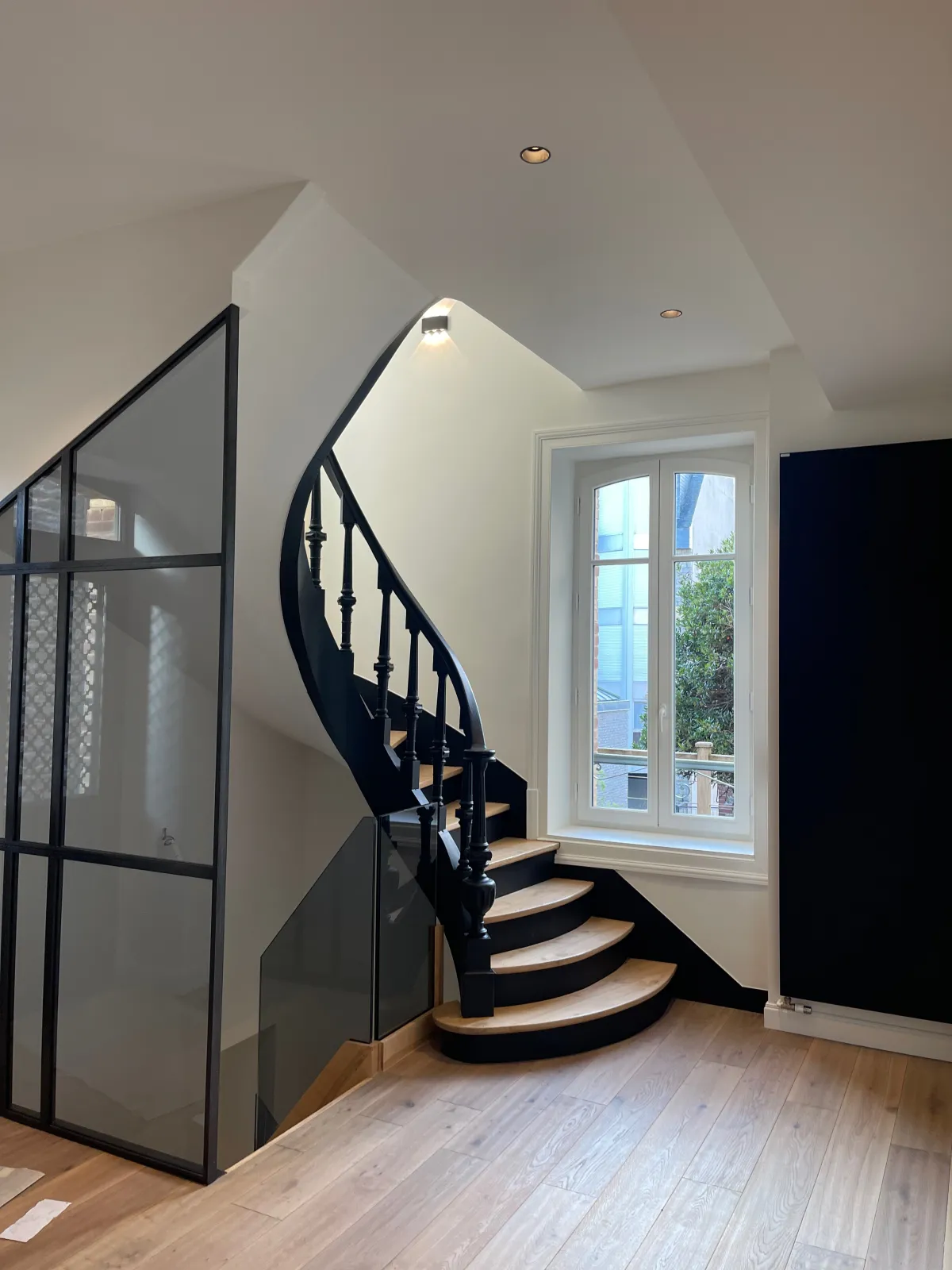 Décloisonner le RDC en préservant et mettant en valeur moulures, parquet, bow windows.